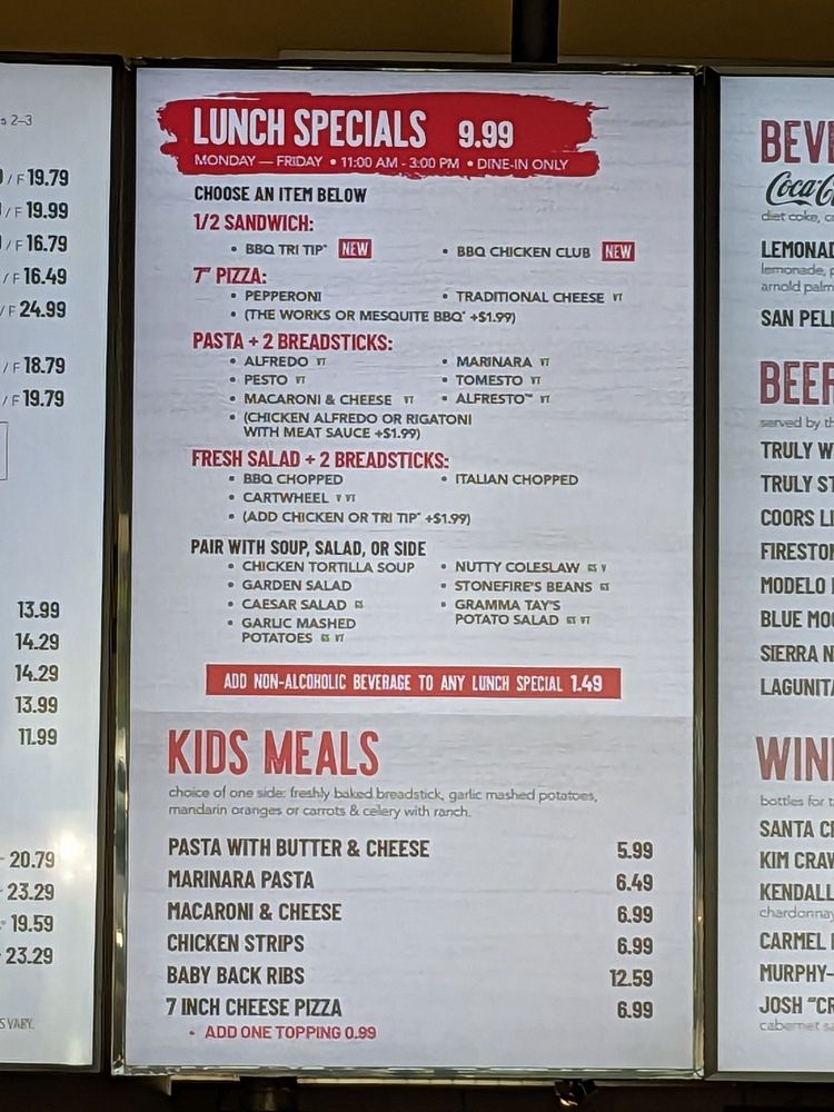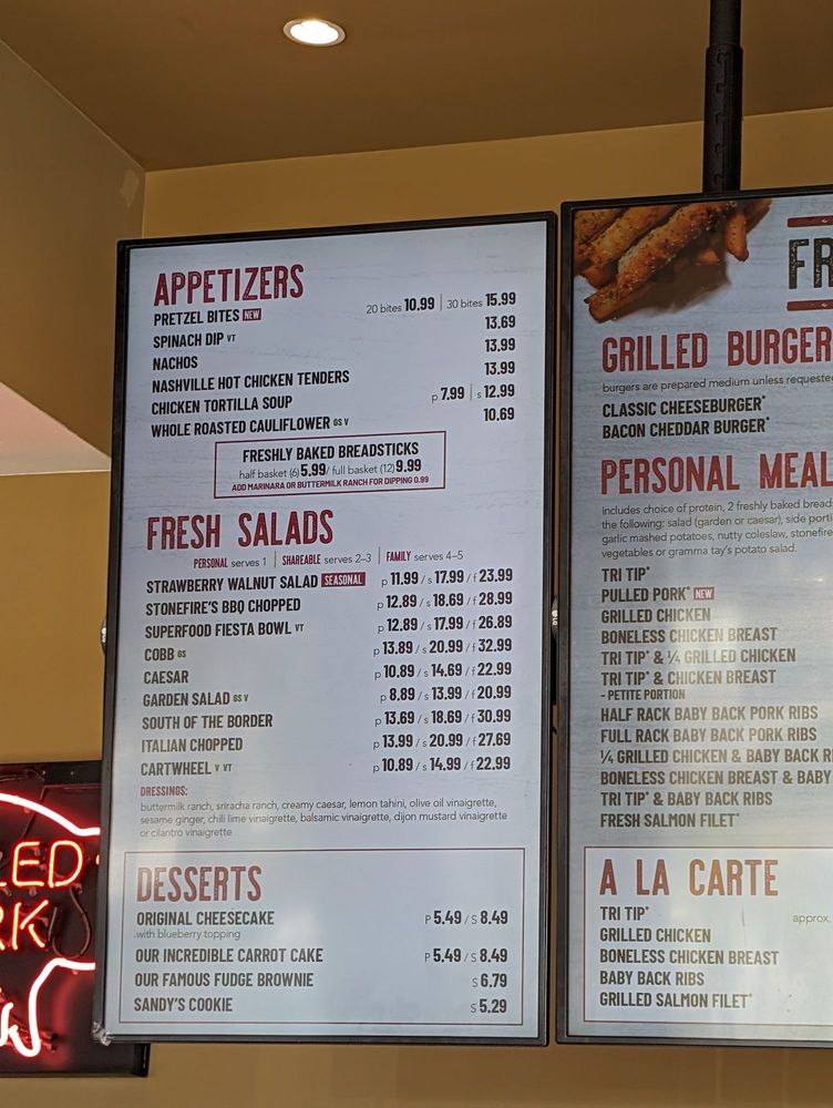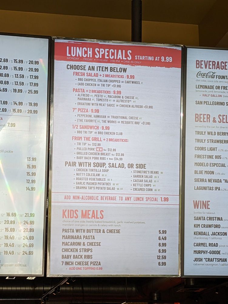 choice of: Chicken Tortilla Soup, Garden Salad, Caesar Salad, Garlic Mashed Potatoes, Nutty Coleslaw, Stonefire's Beans, or Potato Salad.