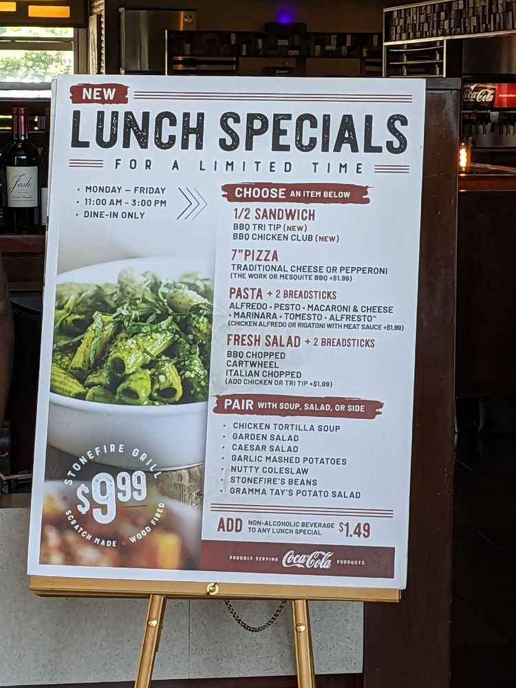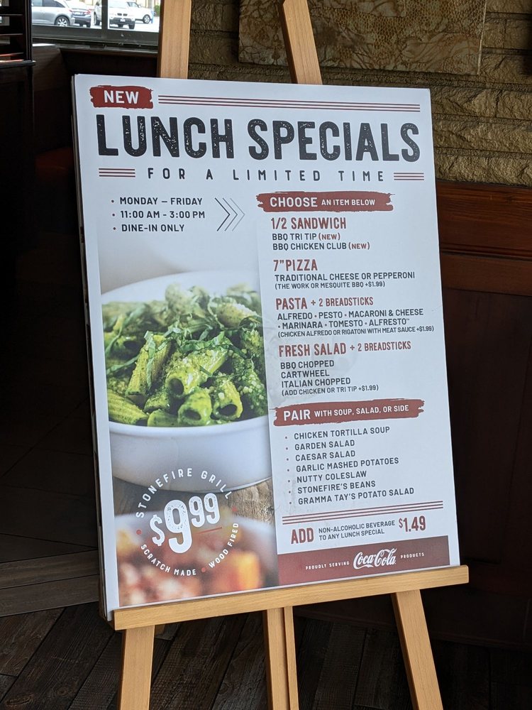 Stonefire Grill offers a diverse menu with options for delivery, takeout, and vegan choices. Located in Lakewood, CA, this restaurant is known for its family meal deals and modern ambiance. Customers praise the affordable prices, generous portions, and delicious food. The Stimulus package, which includes a choice of protein, pasta or pizza, and salad, has been a favorite among patrons. The bbq chicken chopped salad, pesto pasta, and Works pizza are highly recommended. The attentive service and welcoming atmosphere make dining here a pleasant experience. Overall, Stonefire Grill is a great choice for fresh, healthy, and satisfying meals.